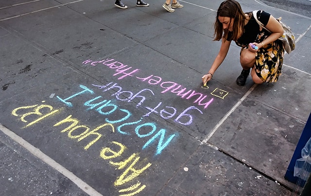 Ao escrever com giz suas experiências de assédio sexual verbal na calçada da rua onde o assédio ocorreu, mulheres do movimento esperam conscientizar as comunidades a respeito do problema.