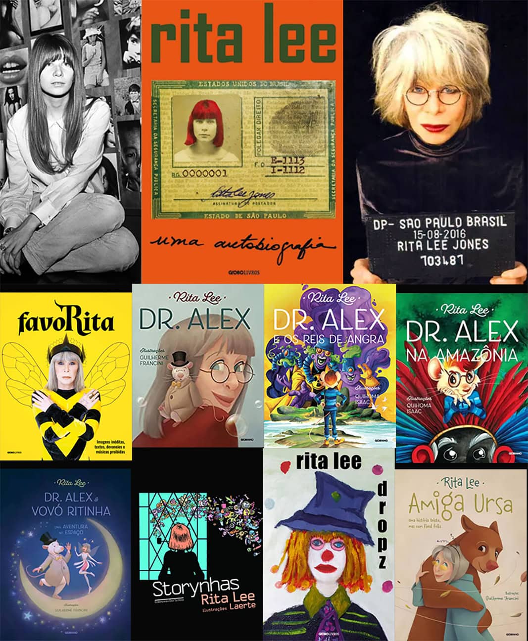 • Biografia e outros: A cantora lançou a sua primeira autobiografia, em 2016, chamada “Rita Lee: uma autobiografia”. Em 2017 lançou um livro de contos chamado “Dropz” e, em 2018, a edição de luxo “FavoRita”. Em 2023, sua segunda obra autobiográfica, intitulada “ita Lee: outra autobiografia”, é lançada postumamente. Em 2024, “O Mito do Mito: de fã e de louco, todo mundo tem um pouco”, o segundo livro póstumo