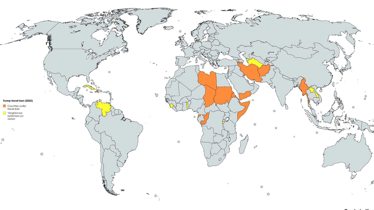 A ordem assinada bloqueia totalmente a entrada de 12 países. São eles: Afeganistão, Mianmar, Congo, Chade, Eritreia, Guiné Equatorial, Haiti, Irã, Iêmen, Líbia, Somália e Sudão.